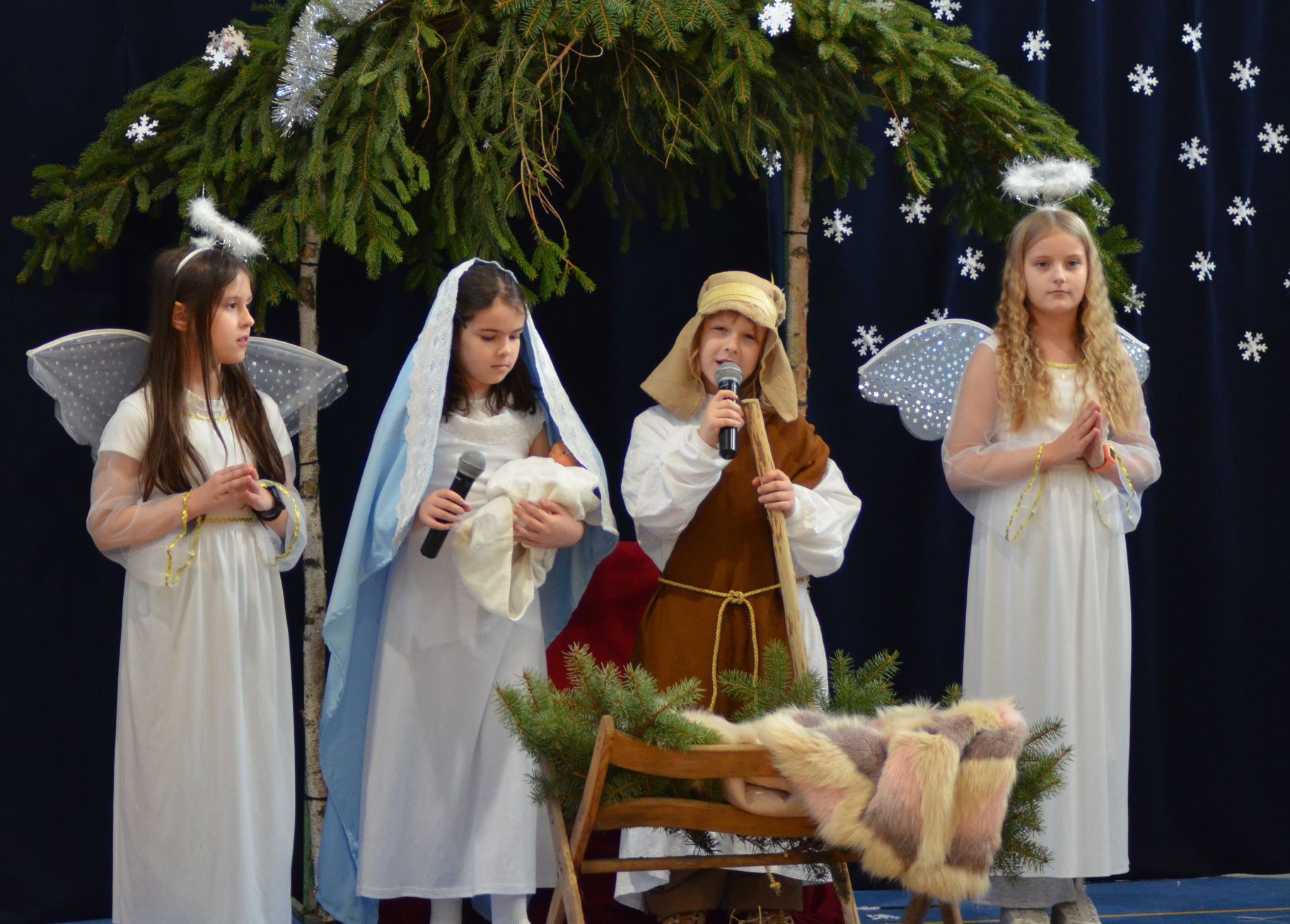 Podczas jasełek uczniowie śpiewali znane i lubiane kolędy, tworząc atmosferę radości, ciepła i wzruszenia. Przedstawienie podkreślało najważniejsze wartości towarzyszące świętom Bożego Narodzenia, takie jak miłość, dobroć, wzajemny szacunek, pomoc drugiemu człowiekowi oraz rodzinne ciepło.